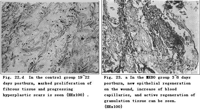 According to our experimental results, in the control group there was sparse blood capillary formation with narrow lumen. The tissue was swollen with fiber proliferation and massive infiltration of inflammatory cells. The disruption of collagen fiber and absence of regenerated epidermis to cover wounds eventually resulted in wound healing by eschar (showed in Fig. 22. d). In the experimental group treated with MEBO, residual skin appendages regenerated into epidermis with multilayers and large nuclei that progressed and covered the wounds (Fig. 23. b-d). Granulation tissue was promoted into regenerative tissue; neoformative blood capillaries were enhanced more than in the control group with larger lumen and richer blood supply, both of which facilitate an enhanced metabolism (Fig. 23. a). Finally, wounds in the experimental group were covered by squamous epithelia and healed without scarring (Fig. 23.g). We noted that when burns wounds were treated by BRT with MEBT/MEBO, the perpetually changing cells began to divide and proliferate toward the wound center along the wound edges or the basal part of residual epithelia, whereas after burns injury, the stable cells residing in skin appendages and grandular epithelium were activated to divide and regenerate into epidermic tissue that in turn migrated toward and finally closed the wound. Pathological examination on days 10-12 postburn showed a transitional migration from skin appendages to regenerated epithelia. When epithelia proliferated and divided, wounds were covered by stratified squamous epithelium. The macroscopic appearance of healed wounds was initially in red or pink and progressively became normal in color.