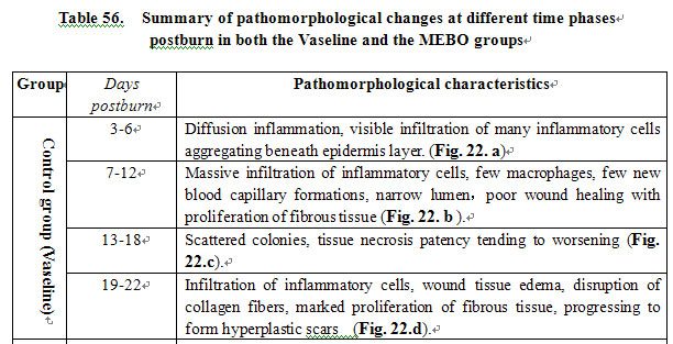 Wounds in the control group (Vaseline) showed slow repairing, obvious proliferation of fibrous tissue and healed with hyperplastic scars. By comparison, wounds in the experimental group (MEBO) expressed rapid repairing, active growth of neoformative epidermis, inconspicuous proliferation of fibrous tissue and eventually healed without scarring. These results demonstrate that MEBO retains optimal wound moisture, while tissue is not immersed. MEBO created a drug membrane that protected and isolated wound tissue from outer contaminant, allowing native histocytes to propagate in a relatively physiological environment in accordance with the nature regenerative law of skin. Local microcirculation was also improved and pathological changes of three zones of burns wounds (necrosis zone, stasis zone and hyperemia zone) were reversed. These conditions were favorable to the recovery of tissues in the stasis zone. Therefore, MEBO was believed to promote epithelial regeneration, control the increased speed of connective tissue, and keep epithelia and connective tissue in an almost normal rate of proliferation so as to heal deep burns wounds with less or minimal scarring.