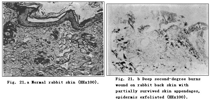 Histologically, the regenerative capacity of skin tissue has a close correlation with tissue repair. Skin cells can be classified into two categories according to the different capability of regeneration: 1) Constantly changing cells,i.e. epidermal cells that have the ability to divide for indefinite periods under a normal state and proliferate to compensate shed and consumed cells. 2) Stable cells as epithelium in the skin body of a gland that cease proliferation when the organs mature, but have a continuous potential for division which is activated after injury to regenerate [1]. Tissue repair is also achieved by two approaches. First, by the regeneration of tissues similar both in structure and function- the structure and function of repaired tissue can be entirely identical to those of the original[2]. Take, for example, the tissue repair of superficial second-degree burns wounds. On days 3~4 postburn, epithelia began to grow, and continued thusly on days 5~8 and was mostly completed on days 8~10 postburn. Secondly, repair of the damaged tissues can be achieved through the formation of fibrous tissue, beginning with formation of granular tissues and ending with scar formation. Microscopic examinations of the tissue repair of deep second-degree and third-degree burns wounds showed an intertexture mainly comprised of fibroblasts and neoformative blood capillaries. Together with infiltration of plasmocytes (such as neutrophil, lymphocyte, plasma cell, macrophage), we note neoformative granulation tissues that were then replaced by a great quantity of closely aligned collagenous intercellular fibers. Subsequent to the decrease of fibroblasts, showing a long and narrow shape, and of blood capillaries, these tissues eventually developed into scars.