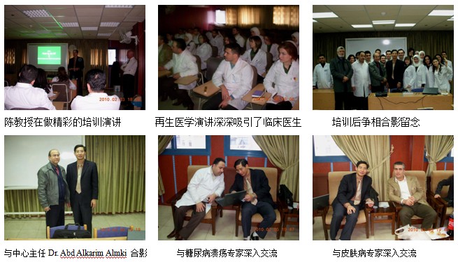 三、2010年2月3日中午,陳教授應(yīng)邀到衛(wèi)生部Damascus Dermatology Medical Center(衛(wèi)生部大馬士革皮膚病醫(yī)療中心),對(duì)該中心的皮膚科、糖尿病潰瘍科和皮膚創(chuàng)傷科的30多名醫(yī)師進(jìn)行了再生醫(yī)學(xué)技術(shù)培訓(xùn),該中心的主任Dr. Abd Alkarim Almki 主持了培訓(xùn)會(huì)議,陳教授以“再生醫(yī)學(xué)技術(shù)促進(jìn)皮膚損傷愈合的機(jī)理與臨床應(yīng)用”為題,介紹了再生醫(yī)學(xué)在皮膚科和創(chuàng)瘍領(lǐng)域的臨床應(yīng)用經(jīng)驗(yàn),大家學(xué)得非常認(rèn)真,覺(jué)得這次的培訓(xùn)為他們治療各種皮膚疾病找到了更有效的方法。再生醫(yī)學(xué)培訓(xùn)在該院引起了很大的轟動(dòng)和反響,掀起了大家學(xué)習(xí)、應(yīng)用再生醫(yī)學(xué)技術(shù)的熱情和積極性。