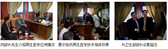 四、2010年2月3日下午,在衛(wèi)生部附屬皮膚病醫(yī)療中心主任Dr. Abd Alkarim Almki的推薦和聯(lián)系下,陳教授一行約見(jiàn)了敘利亞衛(wèi)生部部長(zhǎng)Dr. Reda Saed。在會(huì)見(jiàn)期間,陳教授向衛(wèi)生部部長(zhǎng)介紹了燒傷再生醫(yī)學(xué)技術(shù)的先進(jìn)性、實(shí)用性和該技術(shù)在中國(guó)和其它國(guó)家的臨床應(yīng)用情況以及取得的良好的臨床治療效果。部長(zhǎng)對(duì)燒傷再生醫(yī)學(xué)技術(shù)非常感興趣,希望以后有機(jī)會(huì)到中國(guó)進(jìn)行實(shí)地參觀、考察。這次能夠約見(jiàn)敘利亞衛(wèi)生部部長(zhǎng),為燒傷再生醫(yī)學(xué)技術(shù)在敘利亞的學(xué)術(shù)、技術(shù)全面推廣爭(zhēng)取政府的支持和幫助做好了準(zhǔn)備。