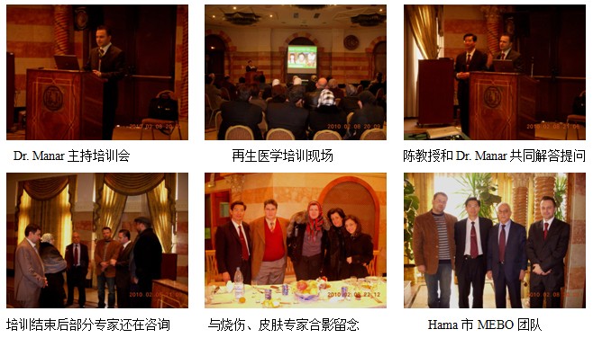 九、2010年2月8日下午2時(shí),Hama市再生醫(yī)學(xué)技術(shù)臨床應(yīng)用培訓(xùn)班在Cham Palace Hotel成功舉辦。來(lái)自全市各醫(yī)院和診所的燒傷、整形、普外、骨科、婦產(chǎn)科、皮膚科的35名臨床專(zhuān)家和5名藥劑師參加了“燒傷再生醫(yī)學(xué)技術(shù)在燒傷、創(chuàng)傷與潰瘍的”專(zhuān)題演講會(huì),反響熱烈,培訓(xùn)效果較好。