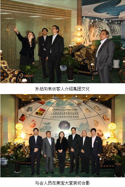 10月22日上午,美寶國(guó)際集團(tuán)董事局主席徐榮祥教授在集團(tuán)貴賓室親切會(huì)見Mr. Hamadi一行將本次訪問活動(dòng)推向了高潮。徐教授表示美寶印尼市場(chǎng)一直以來都是美寶集團(tuán)最為關(guān)注的市場(chǎng)區(qū)域之一,對(duì)雙方所達(dá)成的五年規(guī)劃、新產(chǎn)品發(fā)展計(jì)劃及新的合作模式表示祝賀,并向客人全面通報(bào)了近年來美寶在癌癥研究及再生會(huì)所等方面取得的重大進(jìn)展,并提出印尼將是美寶人體再生復(fù)原俱樂部全球推廣計(jì)劃的基地之一。Mr. Hamadi首先對(duì)于徐教授的介紹表示感謝,對(duì)于美寶在癌癥研究方面取得的成就表示祝賀,同時(shí)對(duì)于徐教授提出的計(jì)劃連聲表示贊同,希望回到印尼后能夠盡快啟動(dòng)這項(xiàng)計(jì)劃,希望自己盡快在印尼享受到人體再生復(fù)原技術(shù)帶來的養(yǎng)生效果。