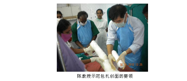 2、11月30日~12月1日,陳教授一行按計劃在KMC燒傷中心進行臨床試驗的培訓,對創(chuàng)面處理技術(shù)進行了示范和指導。按照研究設(shè)計,美寶濕潤燒傷膏印度III期臨床試驗是多中心隨機對照的試驗,因此陳教授先在試驗組示范了燒傷再生醫(yī)學與療法治療燒傷病例的標準操作程序(燒傷再生醫(yī)學之包扎療法),然后又給對照組示范了傳統(tǒng)方法治療燒傷創(chuàng)面的規(guī)范操作技術(shù)。經(jīng)過這2天的簡短的培訓,使參與研究的醫(yī)護人員更多地了解了整個臨床試驗的設(shè)計、實施步驟、創(chuàng)面處理要求、病例登記表的填寫等,為高質(zhì)量和保障安全地展開臨床試驗打下了一定的基礎(chǔ)。