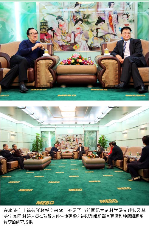 虎尾之年玉兔迎春,在世界生命科學(xué)界熱論人體生命再生延續(xù)秘密的濃厚學(xué)術(shù)氣氛中,應(yīng)美寶國際集團董事局主席徐榮祥教授的邀請,中國醫(yī)師協(xié)會常務(wù)副會長兼秘書長楊鏡教授、副會長蔡忠軍教授、陸君副秘書長、編輯部肖先福主任、辦公室袁亞明主任等一行5人于12月23日蒞臨美寶集團總部參觀指導(dǎo)。