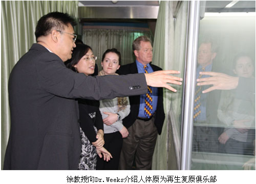 隨后,在徐教授的親自陪同下,來訪客戶參觀了人體原為再生復(fù)原俱樂部會所。徐教授向客人介紹了會所作為人體原為再生復(fù)原科學(xué)主要研究基地之一,近年來的建設(shè)成果以及未來世界范圍內(nèi)的發(fā)展規(guī)劃。會所世界上獨(dú)霸的技術(shù)、獨(dú)特的風(fēng)格、高檔的設(shè)施以及專業(yè)的技術(shù)實(shí)施隊(duì)伍均令Dr. Weeks一行深深折服。