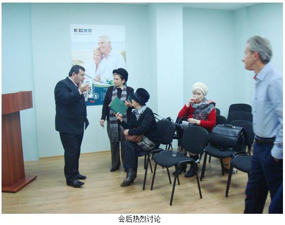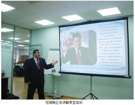 11月20日國(guó)際市場(chǎng)集團(tuán)總裁班子委員, 市場(chǎng)部總經(jīng)理劉鋼專程來(lái)莫斯科了解指導(dǎo)市場(chǎng)開發(fā)工作,并協(xié)調(diào)解決產(chǎn)品物流問題。借總部領(lǐng)導(dǎo)來(lái)臨的東風(fēng),分公司一周內(nèi)舉辦了兩場(chǎng)小型公司招商說(shuō)明會(huì),宣講美寶公司的歷史和發(fā)展,人體原位再生復(fù)原科學(xué)技術(shù)和產(chǎn)品應(yīng)用,美寶直銷業(yè)務(wù)帶來(lái)的健康財(cái)富機(jī)會(huì),一些參會(huì)人對(duì)美寶再生科學(xué)和產(chǎn)品的神奇效果所震驚,在會(huì)后就直接報(bào)單購(gòu)買加入美寶。