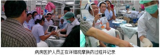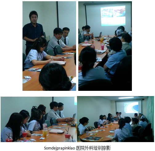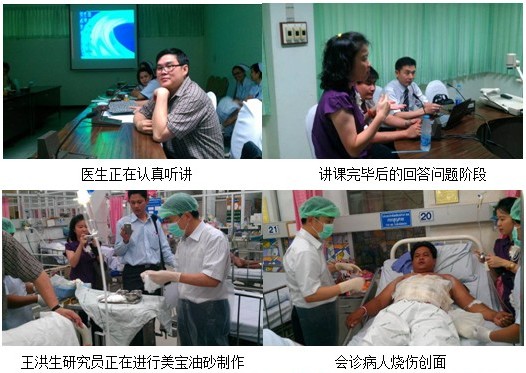 6月19日,美寶團隊驅車4個小時來到距離曼谷200多公里的南部Kampaeng Pet醫(yī)院意外傷害科室(Accident Ward)的4名醫(yī)生和15護士進行再生醫(yī)療技術在褥瘡的最新治療進展。其中,Dr. Akaropong是美寶的重點醫(yī)生,在2011年進行醫(yī)療開發(fā)的時候,該醫(yī)生已經開始嘗試使用再生醫(yī)療技術。今年,他所在的科室的大多數(shù)燒傷病人都已經開始使用該技術。講課結束完畢后,為了讓護士更加規(guī)范的使用再生醫(yī)療技術,王洪生研究員親自為兩位燒傷患者進行了規(guī)范的包扎療法和暴露療法臨床操作。參加的醫(yī)護人員紛紛拿出自己的手機,記錄下整個操作過程。在會診病例時,來自中國的專家也吸引了該院內科的醫(yī)生過來請教并學習,討論關于胃腸道出血的再生治療措施。