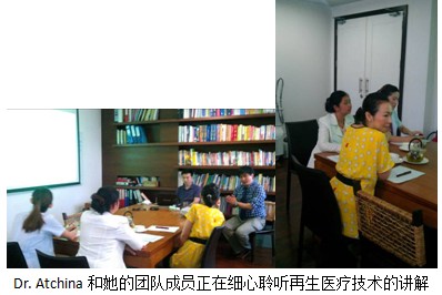 Dr. Atchina介紹說,她使用美寶燒傷膏在激光治療后的創(chuàng)面上,得到了很好的臨床療效。Dr. Atchina非常想知道再生醫(yī)療技術聯(lián)合激光治療各類瘢痕或者單獨治療各類創(chuàng)面的臨床經驗和實際操縱方法。王洪生研究員通過各類不同的臨床對比圖片,詳細的展示了再生醫(yī)療技術在中國的成功應用。Dr.Atchina詳細地詢問了創(chuàng)面及瘢痕治療的各類問題,最后表示非常豐富的臨床經驗,非常棒的技術和產品,我正在做一些臨床對照研究,希望以后能深層次合作。美寶團隊回應非常希望Dr. Atchina能夠總結出自己的經驗并且發(fā)表到各類雜志、期刊。今年9月份,美寶會參加在愛丁堡舉辦的國際燒傷大會,類似的機會在未來會有很多,也希望Dr. Atchina能站在世界的舞臺上讓更多的人了解這項杰出的技術和產品。