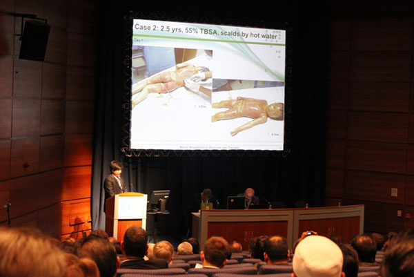 上午10:45分自由演講分會場準(zhǔn)時召開,會場內(nèi)坐滿了前來探討燒傷治療新理念的專家學(xué)者。首先演講的是中國中西醫(yī)結(jié)合協(xié)會國際專家技術(shù)部副主任舒葉,他演講的題目是再生醫(yī)療技術(shù)治療大面積燒傷。眾所周知大面積深度燒傷最終都會導(dǎo)致增生性疤痕以及攣縮與殘疾等問題,不僅增加了患者的經(jīng)濟(jì)負(fù)擔(dān)同時也帶給患者巨大的痛苦。然而通過再生醫(yī)療技術(shù),這些問題都不復(fù)存在。舒主任以兩個典型的大面積深度燒傷病例全面展示再生科學(xué)的治療過程和令人驚嘆的結(jié)果后,針對再生醫(yī)療技術(shù)在大面積燒傷系統(tǒng)治療上與傳統(tǒng)療法的不同之處進(jìn)行了深度剖析。通過規(guī)范化再生醫(yī)療技術(shù)治療,大面積深度燒傷創(chuàng)面可以完全再生復(fù)原而不出現(xiàn)明顯增生性疤痕以及功能障礙。這一成果在世界燒傷界是獨(dú)一無二的也是舉世無雙的,精彩的演講吸引了在場觀眾對此技術(shù)的極大興趣,在演講后的答疑環(huán)節(jié)中許多專家學(xué)者爭先恐后的提出了許多問題,如燒傷創(chuàng)面是如何分度的,以及三度創(chuàng)面處理是否需要結(jié)合其他外科措施,甚至有些帶有明顯質(zhì)疑意味的問題,對美寶的機(jī)理藥理療效都有涉及,舒主任基本都能回答準(zhǔn)確,從容應(yīng)對,整個提問環(huán)節(jié)不亞于又一場激烈的演講和辯論!由于時間有限,很多興致勃勃的專家學(xué)者甚至都沒有得到提問的機(jī)會。