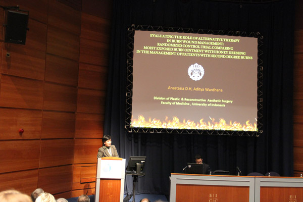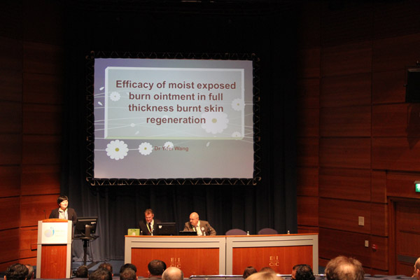 在下午的自由發(fā)言中來自印度尼西亞大學(xué)的Anastasia Dessy 醫(yī)生以再生醫(yī)療技術(shù)與蜂蜜敷料在二度燒傷創(chuàng)面的對比進(jìn)行了演講。她通過兩種方法在創(chuàng)面愈合時間,愈合質(zhì)量,以及愈合后疤痕情況等等幾個方面進(jìn)行了全面對比研究。并得出結(jié)論兩組對比發(fā)現(xiàn)再生醫(yī)療技術(shù)組愈合時間明顯縮短同時患者痛苦小但創(chuàng)面愈合質(zhì)量高,同時指出,在他們醫(yī)院之前的研究中已有蜂蜜輔料對傳統(tǒng)SSD的對比試驗,結(jié)果顯示蜂蜜輔料組明顯優(yōu)于SSD組,因而其結(jié)論是:MEBO是在創(chuàng)面治療中的最佳選擇。在場與會專家非常認(rèn)可并接受這種非常嚴(yán)謹(jǐn)?shù)目茖W(xué)對比試驗,對美寶的結(jié)果表示信服,同時通過上午的發(fā)言對再生醫(yī)療技術(shù)已經(jīng)有了一定的了解,因此提出更為深入的問題,如到底“美寶”是什么?(美寶的成分)以及其藥理,愈后疤痕治療評價等等問題。Anastasia醫(yī)生以她的理解一一給予解答。