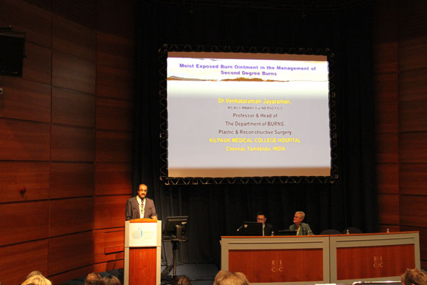 接下來,來自印度南部最大燒傷中心的主任Jayraman 醫(yī)生做了題為再生醫(yī)療技術(shù)在燒傷創(chuàng)面治療的經(jīng)驗的演講。演講過程中Jayaraman主任總結(jié)了此項技術(shù)的極大優(yōu)勢例如保持創(chuàng)面濕潤環(huán)境,抗炎抗感染以及痛苦小等等優(yōu)點(diǎn)。同時也展示再生醫(yī)療技術(shù)在印度臨床試驗過程收集的多個病例,通過生動鮮活的病例折服了在場所有觀眾。特別需要指出的是,Jayraman 主任對美寶的再生機(jī)理給予了詳細(xì)的解釋,從潛能再生細(xì)胞到干細(xì)胞,從再生環(huán)境到再生技術(shù),給與會專家又一全面的美寶科學(xué)的展示。在回答問題的環(huán)節(jié),Jayraman 主任與與會代表探討了燒傷愈后色素沉著的測量方法,美寶作用下干細(xì)胞再生的發(fā)生部位和過程等等,無論是提問還是回答,都相當(dāng)精彩!