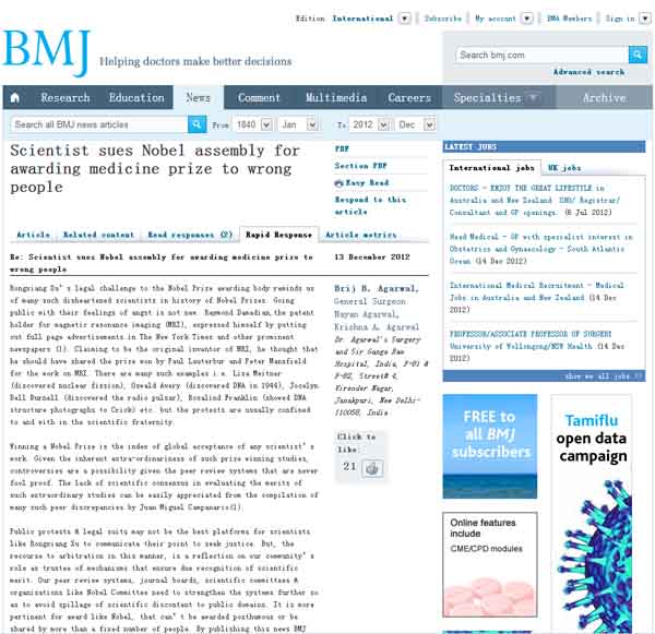 對(duì)于像徐榮祥這樣的科學(xué)家來(lái)說(shuō),公眾抗議和法律訴訟可能不是發(fā)表觀點(diǎn)、尋求正義的最好平臺(tái)。但是,這種求助于法律仲裁的手段卻反映了我們作為那些確??茖W(xué)成就獲得應(yīng)有認(rèn)可的各機(jī)構(gòu)的委托方在發(fā)揮作用時(shí)是存有問(wèn)題的。我們的同行審查系統(tǒng)、雜志董事會(huì)、科學(xué)委員會(huì)以及像諾貝爾委員會(huì)這樣的組織都需要進(jìn)一步加強(qiáng)體制以避免科學(xué)領(lǐng)域內(nèi)的紛爭(zhēng)流溢到社會(huì)公共領(lǐng)域;特別是對(duì)諾貝爾獎(jiǎng)這樣的獎(jiǎng)項(xiàng)而言,這樣的獎(jiǎng)項(xiàng)不能授予給已去世的人、也不能被超過(guò)一定數(shù)量的人所共享。英國(guó)醫(yī)學(xué)雜志(BMJ)能發(fā)布這一訴訟消息就已然說(shuō)明科學(xué)雜志也應(yīng)履行起“看門(mén)人”的職責(zé)而不只是承擔(dān)“啦啦隊(duì)長(zhǎng)”的責(zé)任。
