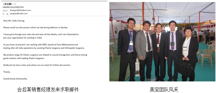 1月25日,大會順利召開,會場內(nèi)氣氛緊張而熱烈,而在會場之外我們又有許多新的收獲,在會場外我與張印經(jīng)理分頭行動,對場外所有的醫(yī)藥行業(yè)參展商進行了交流,向他們介紹了再生技術(shù)的優(yōu)勢以及目前我們的技術(shù)在世界范圍內(nèi)的影響,以及目前在世界區(qū)域及印度當(dāng)?shù)氐氖袌銮熬凹耙?guī)劃,并向部分優(yōu)秀人員流露出美寶印度分公司對優(yōu)秀人才的需求,意想不到的是,多名參展銷售經(jīng)理及銷售人員在聽完介紹后,當(dāng)即便流露出加入美寶的意愿,并在會后發(fā)郵件過來表達自己對美寶的看法及渴望加入到團隊中來,這些人員為今后美寶印度分公司的人力資源儲備給予了極大的補充。
