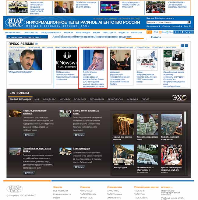 徐榮祥教授喜獲歐洲斯洛伐克Informal Economic Forum (IEF) 經(jīng)濟(jì)俱樂部頒發(fā)的2013年“Golden Biatec”國際獎,引發(fā)國際關(guān)注熱潮,不僅美國等美洲國家高度重視,亦對歐洲俄羅斯等國引發(fā)強(qiáng)烈沖擊。徐榮祥獲獎新聞登于塔斯社新聞網(wǎng)站首頁一整天,成為俄羅斯等國當(dāng)日重大新聞報(bào)道,引發(fā)數(shù)百萬人關(guān)注及熱議。