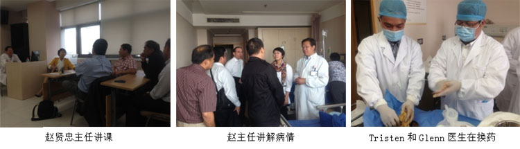 10月14日上午,在舉行簡(jiǎn)短的歡迎儀式后,趙賢忠主任即邀請(qǐng)菲方醫(yī)生來病房查房,重點(diǎn)介紹了一個(gè)51%TBSA的大面積燒傷患者,一個(gè)淺三度前臂燒傷的小兒患者,一位陰囊酸燒傷的患者。并直接觀察換藥全過程。下午,趙主任針對(duì)大面積燒傷的患者進(jìn)行病例討論。期間對(duì)于休克期的治療進(jìn)行了廣泛和深入的交流。