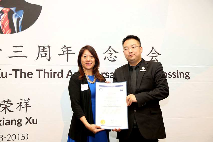 加州平稅局委員馬世云女士希望用徐大夫的科學技術提高更多人的生命質量,并將他的研究方法發(fā)揚光大,讓這個世界因他而變得更美好。馬世云為徐鵬頒發(fā)了徐大夫逝世三周年紀念證書,以表感念。