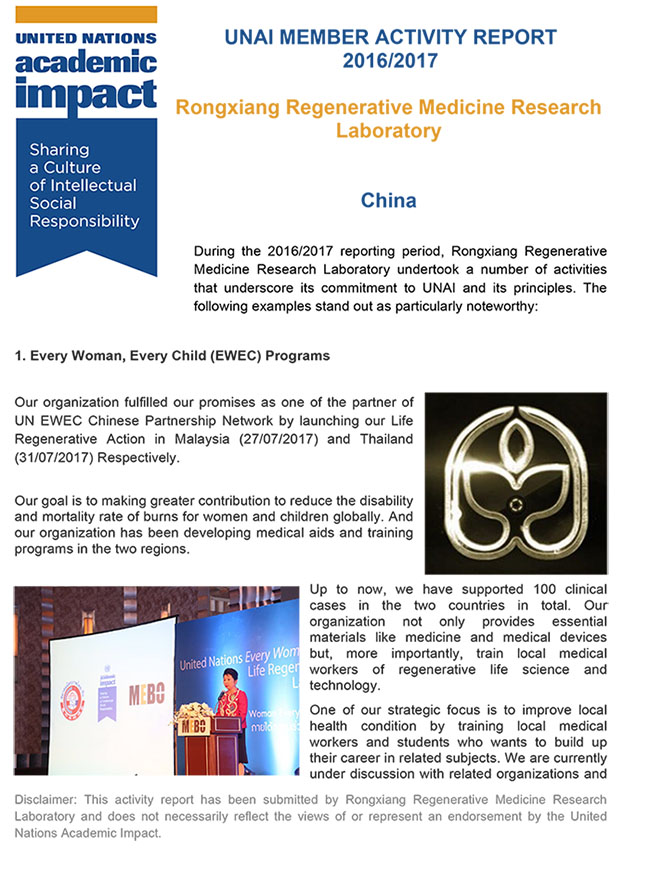 日前,“聯(lián)合國學術(shù)影響”組織特別公布其成員北京榮祥再生醫(yī)學研究所2016-2017年度承諾報告,特別展示了其發(fā)起的聯(lián)合國“每個婦女 每個兒童”中國合作伙伴網(wǎng)絡(luò)承諾,分別在馬來西亞(2017年7月27號)和泰國(2017年7月31號)開展的“生命再生行動”外,還對以燒傷濕潤暴露療法為核心進行的一帶一路倡議——“全球再生醫(yī)療技術(shù)研習班”進展也作為年度重要貢獻項目進行了特別公布。