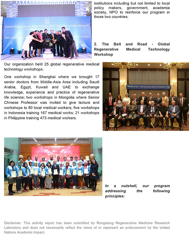 自2016年7月,北京榮祥再生醫(yī)學研究所成為“聯(lián)合國學術(shù)影響“成員來,致力于遵循聯(lián)合國學術(shù)影響“消除貧困、可持續(xù)發(fā)展、全民教育“等原則:對沙特、埃及、科威特、菲律賓、阿聯(lián)酋、印尼等醫(yī)務工作者進行培訓,2017年,共舉辦了25個“全球再生技術(shù)研習班”,總計約千名一帶一路沿線國家醫(yī)務工作者接受了培訓。