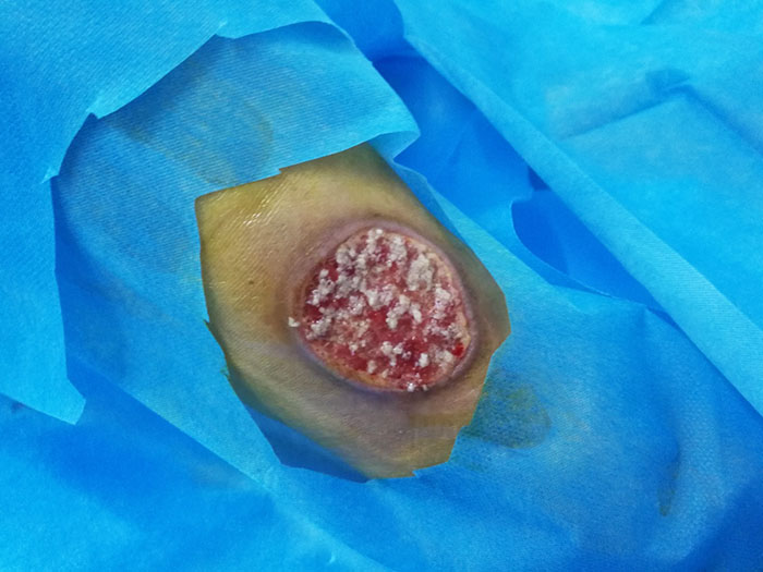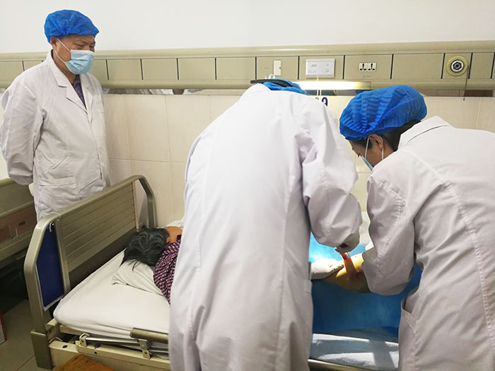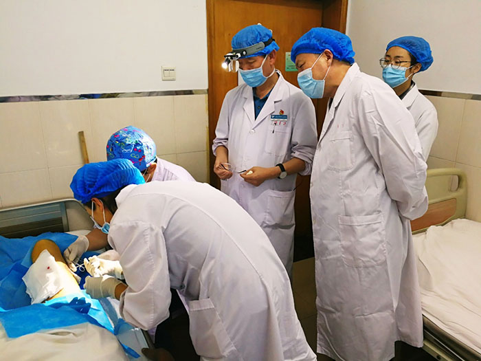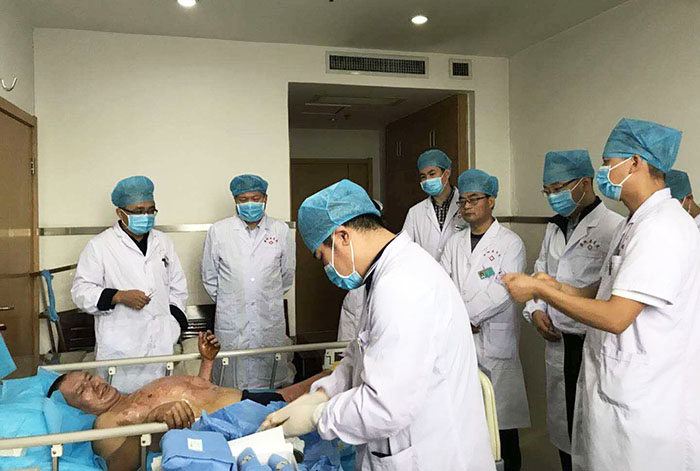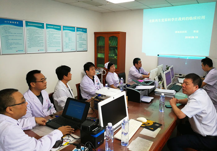 楊智斌總裁此行還會(huì)見了西安交通大學(xué)附屬西安第九醫(yī)院燒傷科肖厚安主任,該院作為陜西中西醫(yī)結(jié)合學(xué)會(huì)燒傷專業(yè)委員會(huì)主委單位,在再生醫(yī)療技術(shù)的臨床應(yīng)用中取得了一定成果,特別是在再生療法配合自體微粒皮種植技術(shù)治療面積較大的皮瓣、組織缺損創(chuàng)面的應(yīng)用方面,解決了傳統(tǒng)燒傷、創(chuàng)面治療缺少皮源這一難題。在肖厚安主任的陪同下,楊智斌總裁還現(xiàn)場(chǎng)觀摩了微粒皮種植術(shù)臨床應(yīng)用,認(rèn)真聽取了該科室多年來應(yīng)用再生醫(yī)療技術(shù)治療的病例總結(jié)。