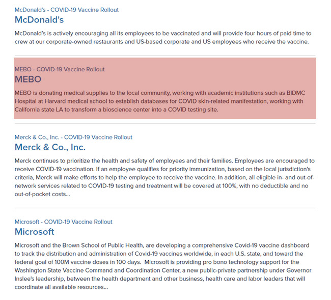 新冠肺炎疫情期間,MEBO不僅向當?shù)厣鐓^(qū)捐贈醫(yī)療用品,與哈佛大學(xué)醫(yī)學(xué)院等學(xué)術(shù)機構(gòu)合作建立新冠肺炎皮膚相關(guān)表現(xiàn)數(shù)據(jù)庫,還將加州州立大學(xué)洛杉磯分校(Cal state LA)徐榮祥生物科學(xué)創(chuàng)新中心設(shè)定為新冠肺炎免費檢測中心。