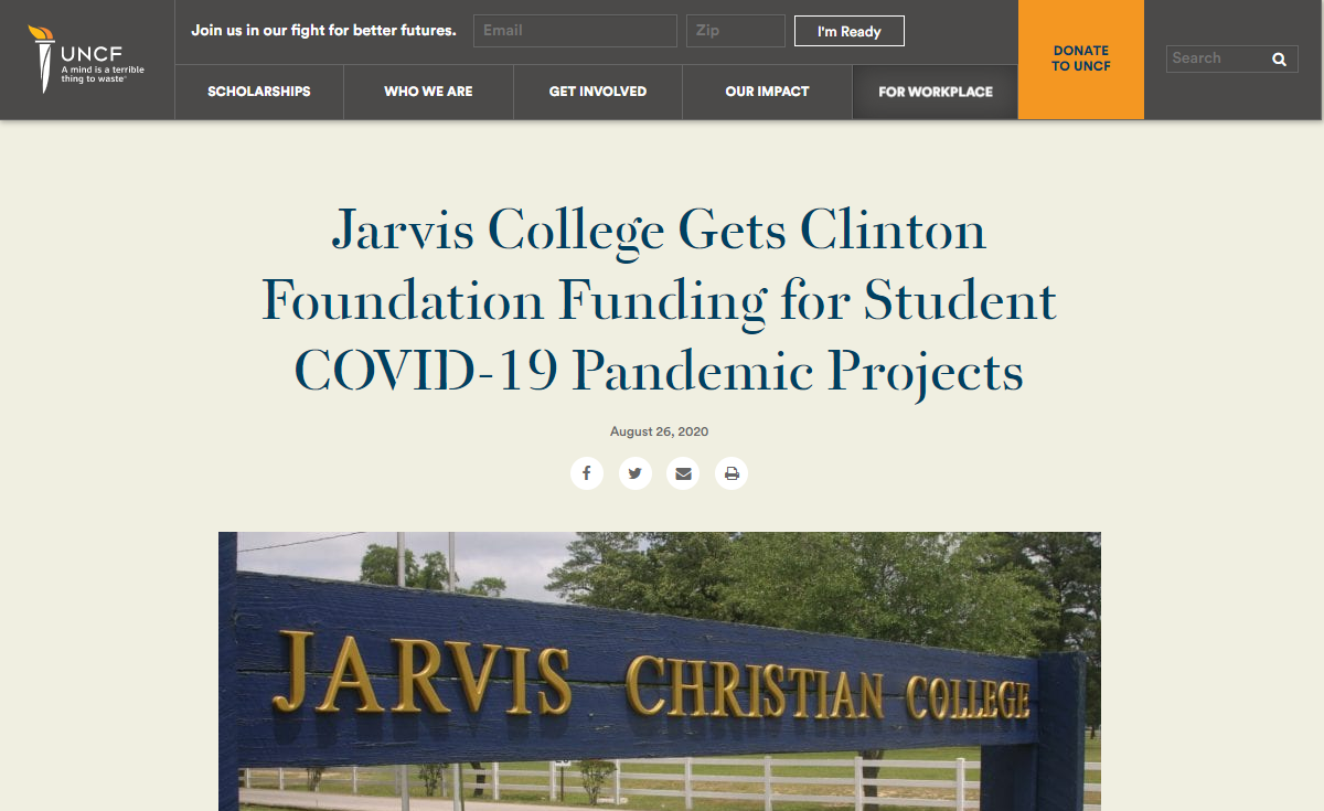 “新冠病毒學(xué)生行動(dòng)基金”獲得者之一,UNCF成員賈維斯基督教學(xué)院(Jarvis Christian College)特別發(fā)布了其獲獎(jiǎng)信息,并公布了獲得該基金支持的12個(gè)國(guó)家的29個(gè)高等教育機(jī)構(gòu):