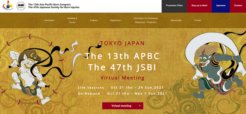 2021年10月21日至10月24日,第13屆亞太燒傷會(huì)議(APBC 2021)暨日本燒傷學(xué)會(huì)(JSBI)第47屆年會(huì)以虛擬會(huì)議的形式舉行。亞太燒傷會(huì)議是國(guó)際燒傷會(huì)議日歷上的一項(xiàng)重要活動(dòng),它匯聚了來(lái)自各國(guó)的醫(yī)生、護(hù)士及科研人員等,為全球醫(yī)務(wù)工作者分享臨床治療經(jīng)驗(yàn)、最新研究成果和臨床管理方法提供了一個(gè)寶貴的平臺(tái)。本屆大會(huì)的主題為“燒傷治療的下一次動(dòng)態(tài)變化——應(yīng)對(duì)感染、預(yù)防和控制感染”(The Next Dynamic Change in Burn Care – Coping with Infection, Infection Prevention and Control)。