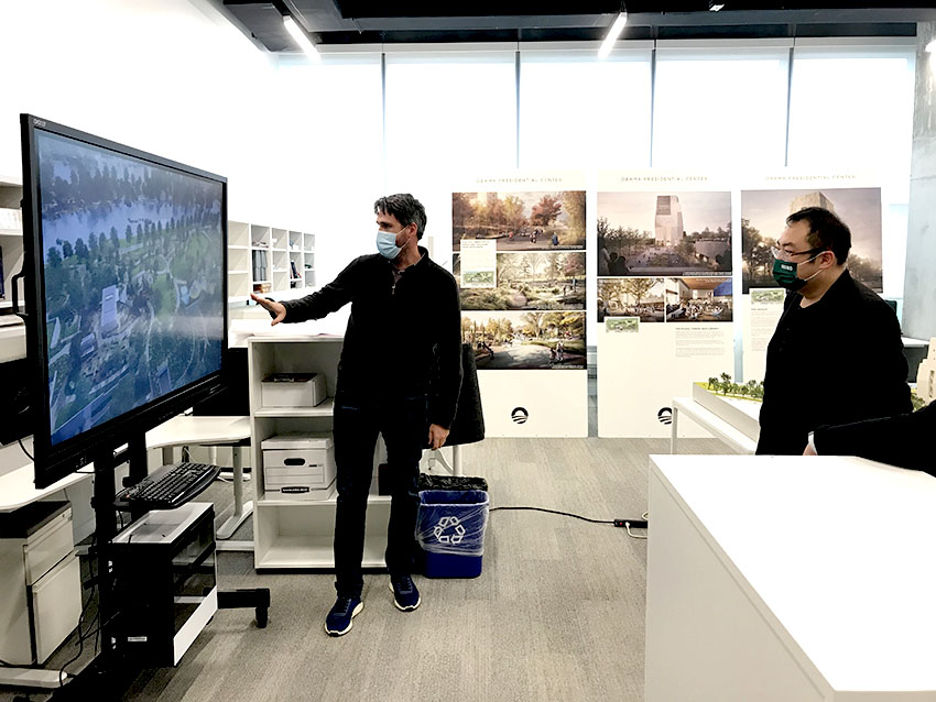 此外,奧巴馬總統(tǒng)中心項目的設計師和主管結合沙盤和三維動畫向徐鵬介紹了項目的設計和軟硬件建設進程。盡管受到疫情影響,奧巴馬總統(tǒng)中心仍將計劃于2025年竣工。