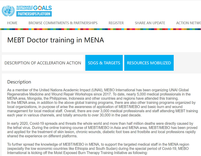 2020年,為進(jìn)一步加強(qiáng)中東和北非地區(qū)的創(chuàng)面管理,提高該地區(qū)人民的整體健康水平,并使患有皮膚病變的新冠肺炎患者受益,美寶國(guó)際提出在中東和北非地區(qū)開展MEBT培訓(xùn)項(xiàng)目倡議(聯(lián)合國(guó)36733倡議),從而在新冠肺炎疫情這一特殊時(shí)期支持相關(guān)醫(yī)療人員。2021年7月,該倡議被納入聯(lián)合國(guó)可持續(xù)發(fā)展目標(biāo)加速行動(dòng)平臺(tái),高效踐行,以充分發(fā)揮其在疫情期間的重要意義。