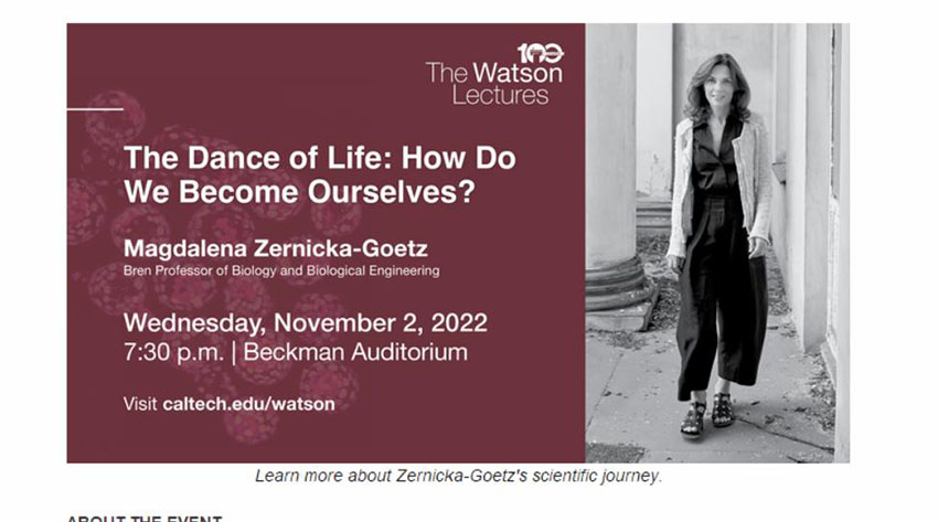 在2022年11月2日舉辦的加州理工學(xué)院一百年前設(shè)立的沃森講座(The Watson Lectures )上,加州理工學(xué)院遴選來繼承徐榮祥科學(xué)精神和路線的陳天橋雒芊芊神經(jīng)科學(xué)研究所發(fā)育生物學(xué)家、Bren生物學(xué)和生物工程教授瑪格達萊娜·澤尼克-戈茨(Magdalena Zernicka-Goetz)就“生命之舞:我們發(fā)育成人的旅程”進行了分享。該講座采用線下線上相結(jié)合的方式進行。