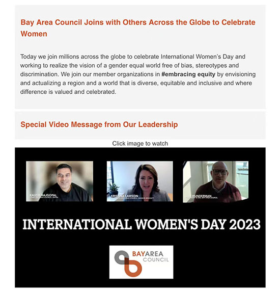 2023年3月8日,國(guó)際勞動(dòng)?jì)D女節(jié),舊金山灣區(qū)委員會(huì)(Bay Area Council)特意舉辦慶?;顒?dòng),邀請(qǐng)其成員組織共同“擁抱公平”,接受并尊重差異,為實(shí)現(xiàn)一個(gè)沒有偏見、陳規(guī)成見和歧視的性別平等世界的愿景而努力,以期構(gòu)建一個(gè)多元化、公平和包容的地區(qū)和世界。