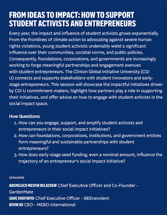 美寶集團(tuán)董事局主席徐鵬再度受邀出席并將于9月18日上午8點(diǎn)至8點(diǎn)30的焦點(diǎn)專題會(huì)議環(huán)節(jié)就“從想法到影響力:如何支持學(xué)生活動(dòng)家和企業(yè)家”進(jìn)行專題發(fā)言與答疑。作為最具影響力的CGI及CGI U倡議承諾者、發(fā)起者及推動(dòng)者,徐鵬將以自身大量實(shí)踐經(jīng)驗(yàn)為與會(huì)者特別是青年企業(yè)家及學(xué)生活動(dòng)家提供建議及策略,并強(qiáng)調(diào)如何通過合作伙伴支持在倡議方面發(fā)揮更多作用;徐鵬還將就如何參與、支持和擴(kuò)大學(xué)生活動(dòng)家和企業(yè)家的社會(huì)影響力,基金會(huì)、公司、機(jī)構(gòu)和政府實(shí)體如何與學(xué)生企業(yè)家建立有意義和可持續(xù)的伙伴關(guān)系以及如何增加企業(yè)家社會(huì)影響力等給予解答。同時(shí),作為APEC2023籌委會(huì)聯(lián)合主席,徐鵬還將以APEC中的青年力量為主題,激勵(lì)更多學(xué)子對(duì)世界發(fā)揮應(yīng)有的責(zé)任與擔(dān)當(dāng)。