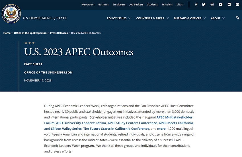美國國務院發(fā)布2023 APEC成果報告,灣區(qū)委員會相關(guān)活動列為重要成果