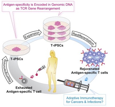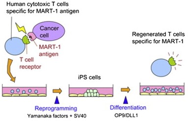 研究團(tuán)隊(duì)使用的技術(shù)引用了已知的因子(山中申彌使用的因子)將成熟的免疫T細(xì)胞轉(zhuǎn)化為iPSCs。然后擴(kuò)增這些iPSCs并使他們重新分化為T細(xì)胞。新生成的T細(xì)胞被還原(rejuvenate)后生長(zhǎng)潛能提高、壽命延長(zhǎng),且仍然具有最初的識(shí)別癌癥和艾滋病感染靶細(xì)胞的能力。這意味著用iPSCs技術(shù)調(diào)控T細(xì)胞可能幫助將來(lái)建立更有效的免疫療法。