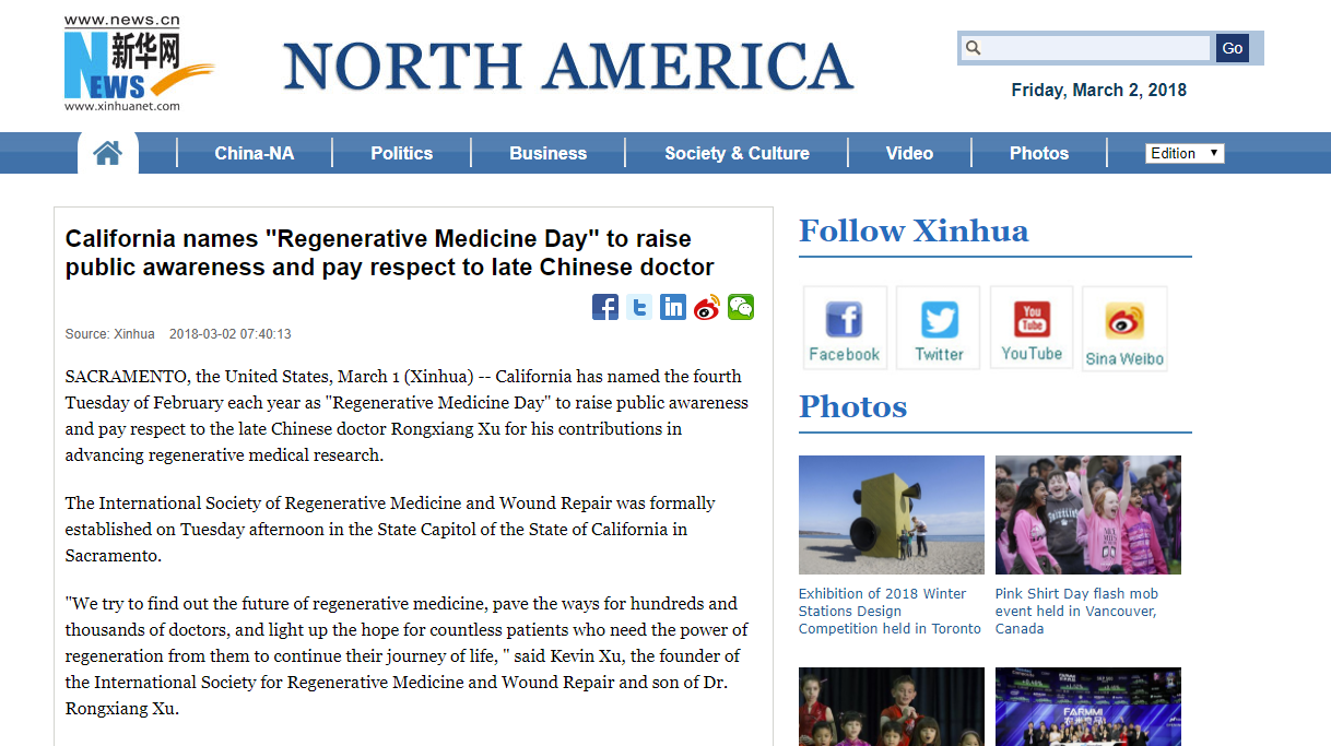 新華網(wǎng):美國設(shè)立“再生醫(yī)學(xué)日”致敬已故的中國醫(yī)生