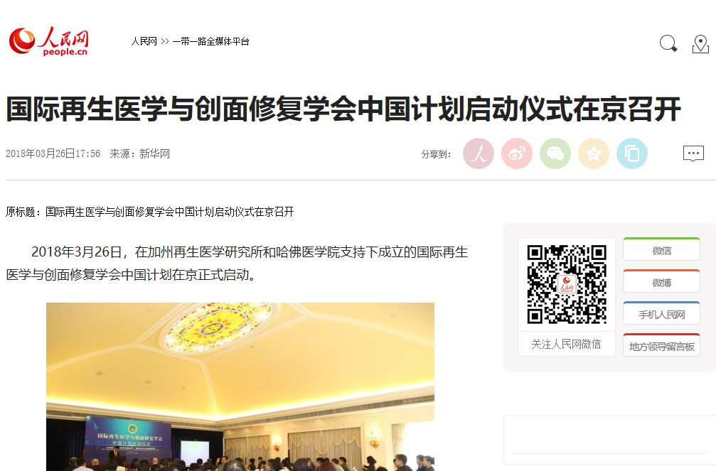 人民網(wǎng):國際再生醫(yī)學(xué)與創(chuàng)面修復(fù)學(xué)會(huì)中國計(jì)劃啟動(dòng)儀式在京召開