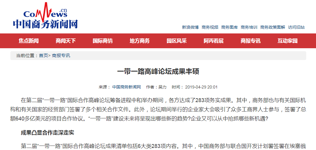 中國(guó)商務(wù)新聞網(wǎng):一帶一路高峰論壇成果豐碩