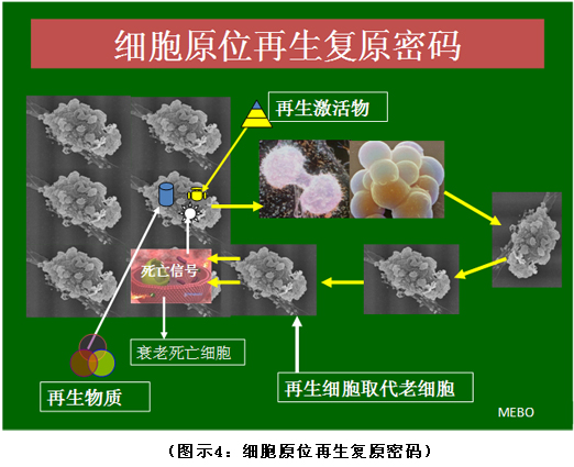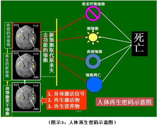 首先復(fù)習(xí)一下第一個(gè)生命之謎(詳見圖示3)。“破解人體生命延續(xù)之謎”我們?cè)?002年就已經(jīng)公布了,秘密在于當(dāng)人體細(xì)胞在開始走向衰老、癌變、疾病、凋亡這四個(gè)路線的時(shí)候,其臨近的再生潛能細(xì)胞可以在再生物質(zhì)的作用下被激活并發(fā)揮其細(xì)胞自身的再生潛能,從而再生出新的細(xì)胞取代原來失去功能的細(xì)胞,這是人體再生復(fù)原的密碼和機(jī)理,它早已在斷指、燒傷、創(chuàng)傷、胃腸粘膜損傷等多個(gè)領(lǐng)域得以應(yīng)用并獲得成功。在人體再生復(fù)原程序公布以后,世界生命科學(xué)的研究方向都開始逐步調(diào)整到這個(gè)方向上來,而我們則已經(jīng)開始人體應(yīng)用了,并且根據(jù)實(shí)現(xiàn)的結(jié)果、總結(jié)的規(guī)律證明了再生科學(xué)的真實(shí)性,就跟破案一樣,根據(jù)結(jié)果逐步推理得出事實(shí),而很多生命科學(xué)的研究者還處于探究之路上,所以說我們是完成者的秘密,他們是探索者的小結(jié)。