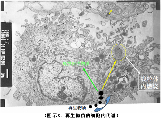 我們看用電子顯微鏡觀察的正常細(xì)胞、癌細(xì)胞和再生物質(zhì),可以看到再生物質(zhì)是通過脂肪酸的通道(細(xì)胞膜吸收物質(zhì)的通道有很多,有能量通道,有各種機(jī)制運(yùn)轉(zhuǎn)通道,還有一個(gè)通道是脂肪酸通道)直接進(jìn)入的,脂肪酸通道是細(xì)胞與大自然的自然接觸過程。有的病毒進(jìn)入細(xì)胞就是靠細(xì)胞的這種特性進(jìn)入的,進(jìn)入細(xì)胞后就占領(lǐng)了所有細(xì)胞器。有些所謂的科學(xué)家們就是用這種通道使轉(zhuǎn)基因、病毒等物質(zhì)大量的進(jìn)入細(xì)胞,最后把別人(細(xì)胞生命)都帶亂了。所以我們02年就呼吁并堅(jiān)決反對(duì)不了解生命、隨便破壞生命的研究,不了解生命內(nèi)在的關(guān)系,誰帶入誰都是犯滅絕人類罪,這樣做是反人類的。再生物質(zhì)通過脂肪酸通道,進(jìn)入到細(xì)胞內(nèi)(詳見圖示5)