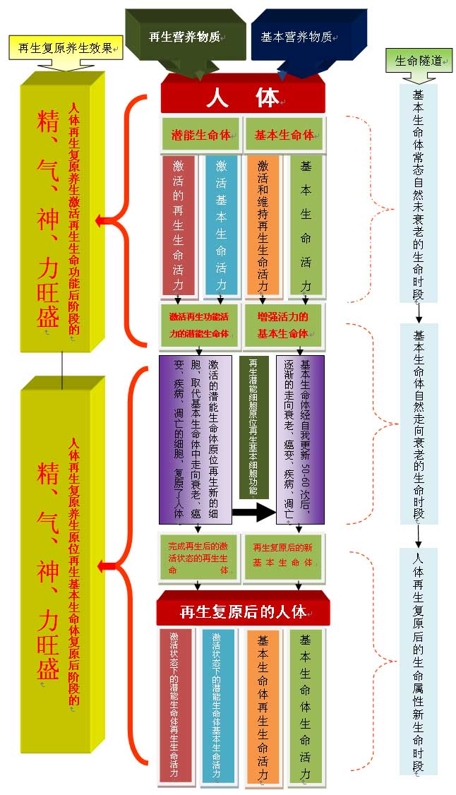 “生命體”、“生命環(huán)境”以及“再生營(yíng)養(yǎng)”是人體再生復(fù)原的技術(shù)實(shí)施前提和基礎(chǔ),結(jié)合運(yùn)用“再生復(fù)原技術(shù)”便可以實(shí)現(xiàn)人體生命的“精、氣、神、力”持續(xù)旺盛。其中,“再生營(yíng)養(yǎng)”是人體再生復(fù)原科學(xué)核心技術(shù)中最重要的組成部分,研究表明,它具備四大功能,第一,啟動(dòng)并喚醒人體“潛能生命體”的生命功能,使其發(fā)揮基本生命體的生命功能,保障和加強(qiáng)人體基本生命功能的力量;第二,激活并啟動(dòng)人體“潛能生命體”的再生基本生命體的程序,即當(dāng)“基本生命體”中的細(xì)胞出現(xiàn)衰老、癌變、凋亡、嚴(yán)重疾病這四大死亡程序時(shí),“潛能生命體”可以原位再生一個(gè)新的基本生命體,替換(或補(bǔ)充)原來(lái)器官組織中因四大死亡程序而導(dǎo)致的基本生命體缺如,從而實(shí)現(xiàn)基本生命體的結(jié)構(gòu)完整、生命功能正常;第三、激活“基本生命體”的“再生生命活力”;第四,激活“潛能生命體”的“再生生命活力”。人體再生復(fù)原的核心就是利用“再生營(yíng)養(yǎng)”的這四大功能,在保障人體“基本生命”的同時(shí)實(shí)現(xiàn)了人體的“再生生命”及“再生基本生命體”的功能,“潛能生命體”原位再生復(fù)原組織器官的結(jié)構(gòu)、保障和加強(qiáng)組織器官功能的同時(shí),人體原來(lái)未發(fā)揮功能的細(xì)胞都參與到了機(jī)體的一線工作當(dāng)中,兩者共同作用實(shí)現(xiàn)了超越常規(guī)健康的人體整體生命活力旺盛的表達(dá),即“精、氣、神、力”旺盛。