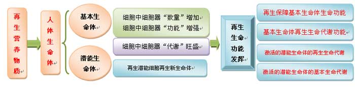 “再生生命功能”即是細(xì)胞吸收再生營(yíng)養(yǎng)物質(zhì)后產(chǎn)生的新生命活力和激活的潛能生命體的功能。細(xì)胞再生后生命體并未發(fā)生量的變化,細(xì)胞總量是一定的,多產(chǎn)生一個(gè)細(xì)胞都是腫瘤,而再生是實(shí)現(xiàn)細(xì)胞缺一個(gè)補(bǔ)一個(gè)、死亡一個(gè)換一個(gè)。當(dāng)異常細(xì)胞經(jīng)過(guò)再生更新后成為正常細(xì)胞,而一個(gè)正常細(xì)胞要發(fā)揮兩種生命功能,一個(gè)是基本生命功能,另一個(gè)就是再生生命功能。此處重點(diǎn)闡述再生生命功能的發(fā)揮,如下圖所示: