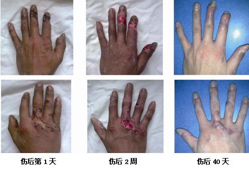 本組28例手部電擊傷創(chuàng)面全部治愈,愈合時間最短22天,最長65天,平均39天。創(chuàng)面愈合后無明顯瘢痕生長或淺表性瘢痕柔軟,無明顯關(guān)節(jié)功能障礙。(見下圖)
