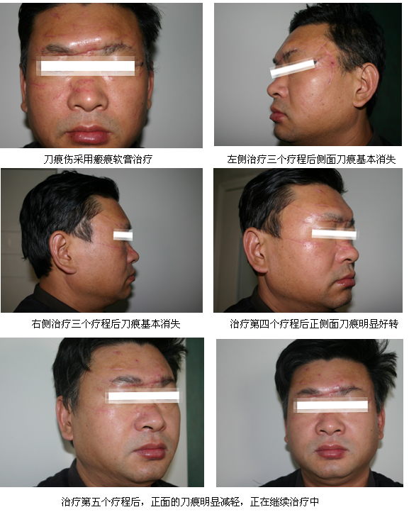 病例二:程某 ,男 ,27歲,農(nóng)民 。該患2010年2月誤被刀砍傷面部,傷口愈合后刀痕明顯,無法面對(duì)正常生活,逐產(chǎn)生輕生念頭。家人四處求醫(yī)為其治療,效果都不理想。2010年8月10日,該患接受河南大學(xué)附屬南石醫(yī)院采用原位再生醫(yī)療技術(shù)治療,治療效果滿意。如下圖。