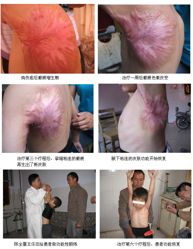 病例三:張某,男,6歲。該患2010年1月9日被炮火燒傷,住院90天,傷面封閉。該患創(chuàng)面愈合后出現(xiàn)瘢痕增生、粘連、攣縮,功能發(fā)生障礙,胳膊不能上舉?;颊邆?個(gè)月在安陽市滑縣第三人民醫(yī)院接受皮膚再生醫(yī)療技術(shù)治療,經(jīng)治療6個(gè)療程,患肢功能已恢復(fù),瘢痕增生部分正在逐步消失,色素逐漸淡化。圖片如下。