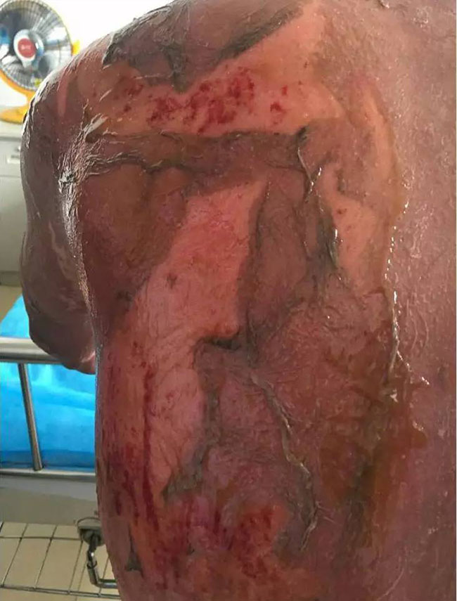 部分創(chuàng)面顏色由紅色轉為粉紅色,基本無淡黃色漿液性滲出液流出,皮膚情況進一步好轉,繼續(xù)使用美寶濕潤燒傷膏。