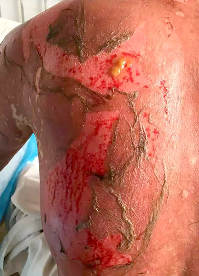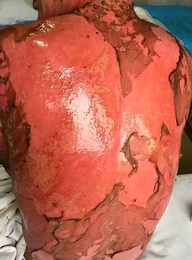 創(chuàng)面可見新生的粉紅色上皮組織,患者全身大部分皮膚恢復情況較好。