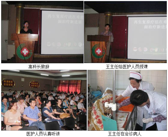 2012年4月13日上午,應(yīng)廣東省農(nóng)墾中心醫(yī)院之邀,中國中西醫(yī)結(jié)合學(xué)會燒傷專業(yè)委員會常委兼秘書、《中國燒傷創(chuàng)瘍雜志》副總編輯、北京美寶燒傷創(chuàng)瘍研究所副所長、第二臨床研究部主任王洪生研究員到醫(yī)院做“再生復(fù)原療法在深度燒傷及難愈性創(chuàng)面治療新進展”專題學(xué)術(shù)講座。廣東省農(nóng)墾中心醫(yī)院全院的醫(yī)護人員均參加了此次培訓(xùn),在學(xué)術(shù)講座中,王主任首先向與會的專家介紹了著名生命科學(xué)家、醫(yī)學(xué)家、人體再生復(fù)原科學(xué)的創(chuàng)立者、再生復(fù)原療法的發(fā)明人徐榮祥教授近年來在再生醫(yī)學(xué)領(lǐng)域所取得的重大實驗及臨床研究成果,而后王主任結(jié)合了大量的臨床病例圖片及錄像資料,主要針對深度燒傷及各類難愈性創(chuàng)傷、潰瘍創(chuàng)面的規(guī)范化處理方法與技巧、注意事項等進行了細致地講解,在座的各位醫(yī)護均被這神奇的療法折服。會后,醫(yī)護人員向王主任詢問了臨床上所遇到的問題,王主任一一作了詳細解答。該醫(yī)院醫(yī)務(wù)科高科長作總結(jié)發(fā)言時,高度贊揚了再生復(fù)原療法,稱之為一種為患者帶來福音的一種療法。隨后,應(yīng)高科長和老年科護長的邀請,王主任親自到老年科對一名深度褥瘡患者進行了會診,并提出治療建議。