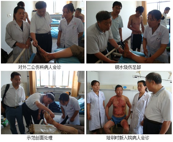 2009年6月9日中國中西醫(yī)結(jié)合學(xué)會燒傷專業(yè)委員會常委、北京美寶燒傷創(chuàng)瘍研究所臨床部研究員、燒傷創(chuàng)瘍專家金黨軍主任和山西省辦事處董在新、張堯同志一起走訪了太谷縣中醫(yī)院,和外科曹新亮主任進行了再生復(fù)原醫(yī)療技術(shù)的臨床應(yīng)用交流。早上九點我們在外科曹主任的帶領(lǐng)下會診了醫(yī)院的6位燒傷病人、六位都是鐵水燒傷,面積小,屬于重度燒傷,在會診完這六位病人后,金教授結(jié)合住院病人的創(chuàng)面處理情況、給全科醫(yī)人員講了燒傷再生復(fù)原醫(yī)療技術(shù)臨床規(guī)范應(yīng)用培訓(xùn)課。
