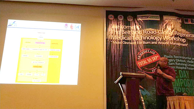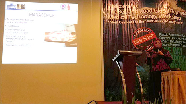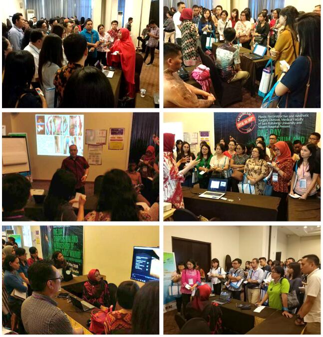 會議中,來自雅加達的Dr. Vika Tania/Dr. Afriyanti Sandhi/Dr. Aditya Herwandar講解了燒傷創(chuàng)瘍?nèi)梭w復原的基本理論; Dr. Aditya Herwandar/Dr. Donna Savitry/Dr. Puri Ambar Lestari則就創(chuàng)瘍的再生醫(yī)學基本護理進行了闡述;Dr. Donna Savitry/Dr. Laksmi Achyati/Dr. Afriyanti Sandhi則以再生醫(yī)學燒傷的基本護理為主題展開論述;而Dr. Vika Tania/Dr. Puri Ambar Lestari則通過燒傷病例的分享讓大家更好的了解這一技術(shù);Dr. Mendy H.Oley/Dr. Maximillian Ch.Oley則分享了治療過程中控制疼痛的方法。隨后在場200余位參會者分六組進行了討論,以燒傷在不同場景和情況下的急救措施和后續(xù)護理為重點進行了熱烈的交流。
