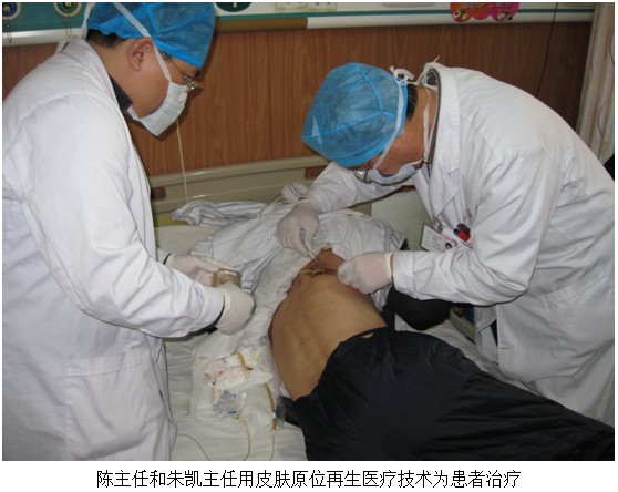 朱凱主任說(shuō):“原來(lái)只知道MEBO治療燒傷,不知道還有其他用途?!标愔魅谓o病人做了清創(chuàng)術(shù),并用人體皮膚原位再生醫(yī)療技術(shù)治療(見(jiàn)圖片)。兩天后,病人不再發(fā)燒,體溫由40℃降至37℃。目前用人體皮膚原位再生醫(yī)療技術(shù)繼續(xù)治療中,詳細(xì)請(qǐng)看下期報(bào)道。